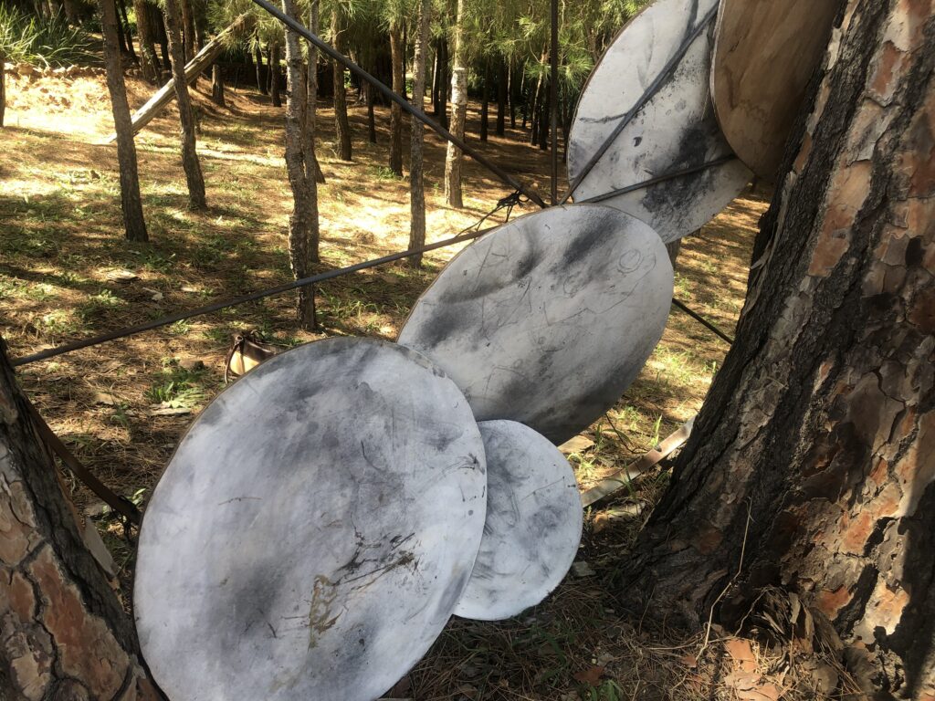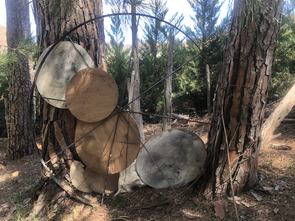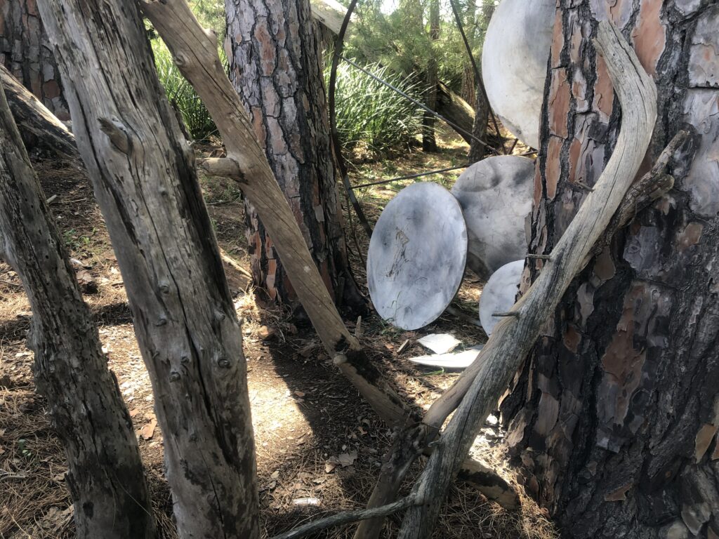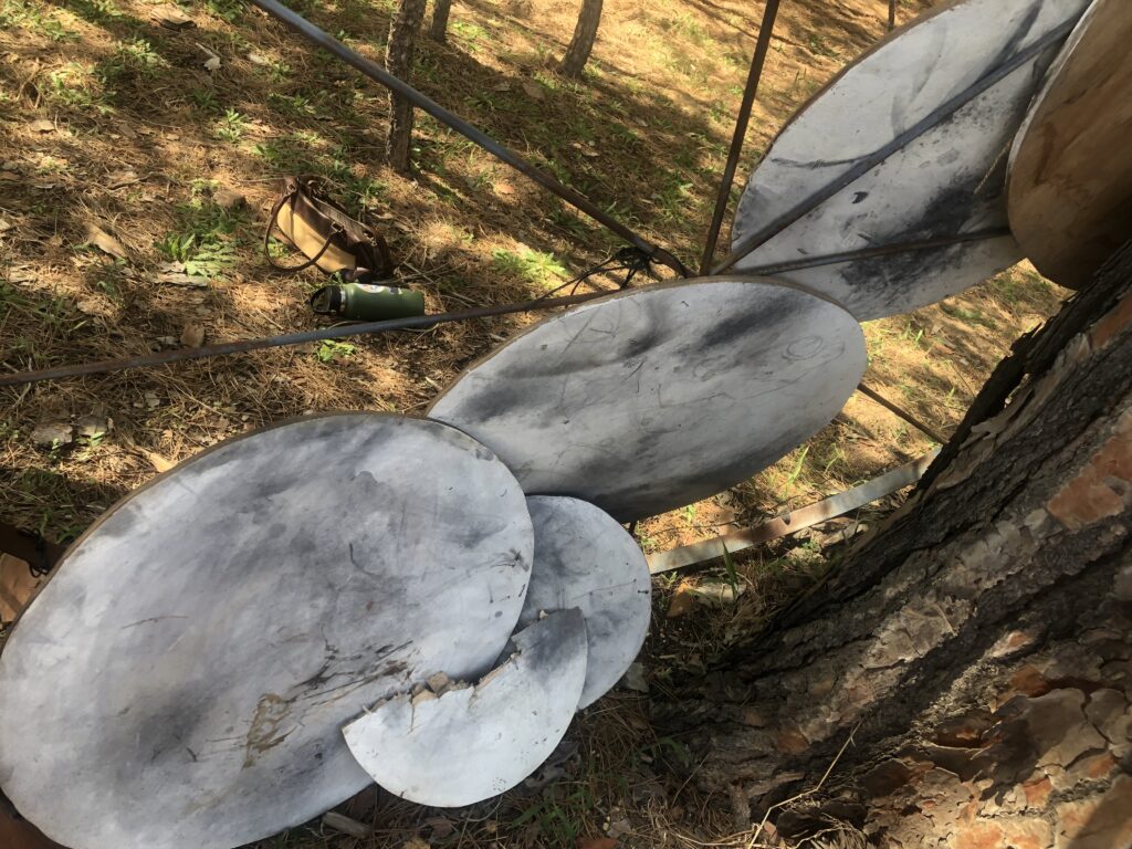 My return to the site was met with some shock, as the structure was removed from the forest floor. The gardeners informed me that they had moved it out of concern for the safety of the circles on the steel structure. It seems that children have played in the area and have done some damage. I was so touched by their concern and the way they placed the circle and enclosed it with plant material – almost like a new nest for the work. This concern and care were much appreciated – almost a way to protect the work. One of the circles have been damaged, it is broken, but the idea of repair was immediately in my mind. Some of the works have scribbles of kids interacting with it – that is great!